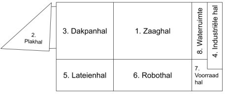 Ongeveer 10000 m2 van de 37800 m2 wordt in beslag genomen door onze productiehal. In deze hal zijn op de begane grond grofweg acht ruimtes te onderscheiden. Dit zijn de Zaaghal, Plakhal, Dakpanhal, Industriële hal, Lateienhal, Robothal, Voorraadhal en de Waterruimte.